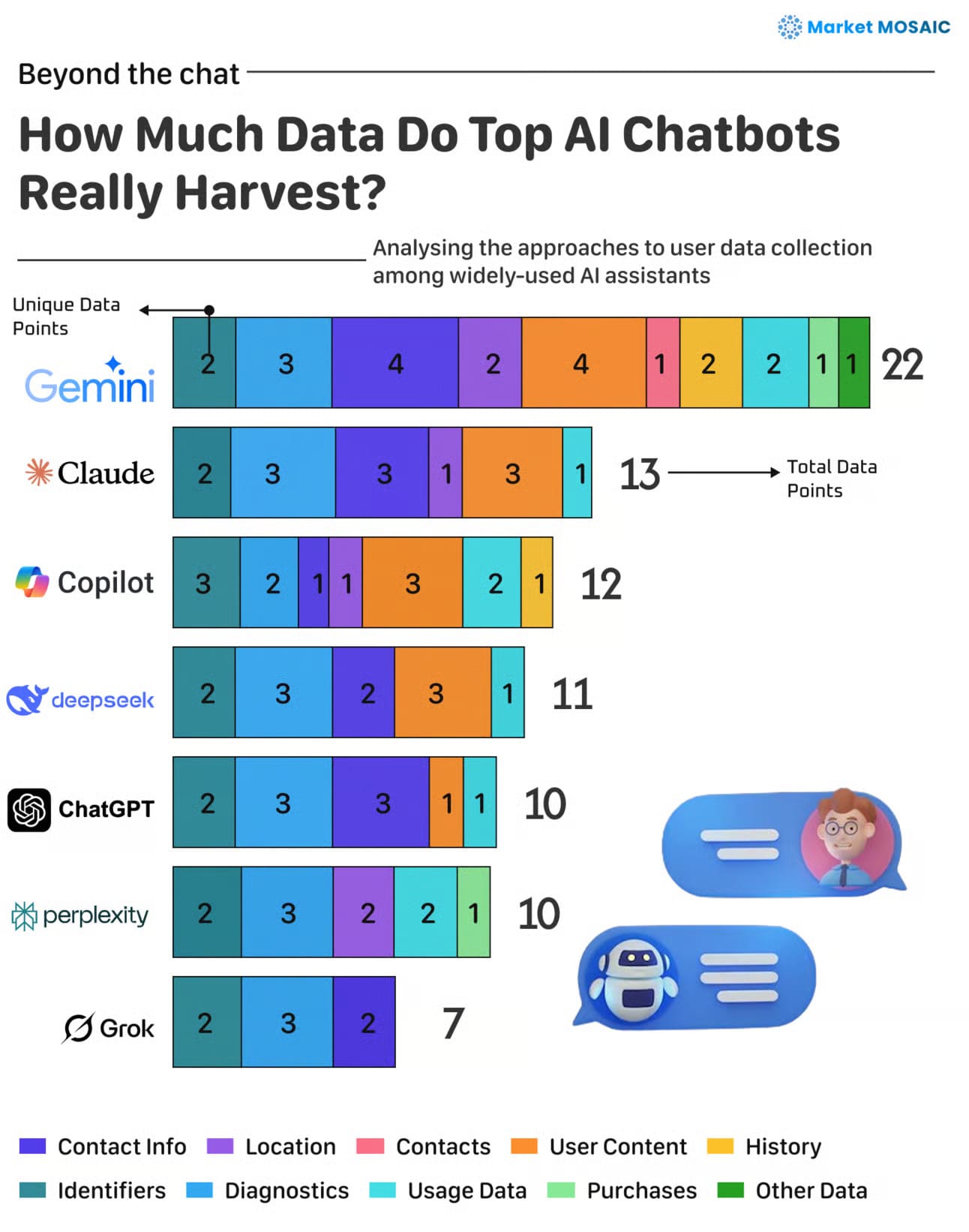 The differences in how AI platforms handle privacy are especially clear when you compare how much data various chatbots collect from users. Google’s Gemini, for instance, collects 22 different categories of user data. In contrast, Elon Musk’s xAI Grok gathers just 7. This gap is not just technical, it’s strategic.